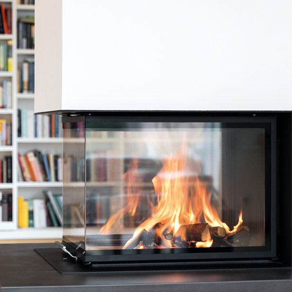 Hoxterの設計の中でも、自浄式のガラスは高いプライオリティーがあります。燃焼空気はガラスに沿いながら、エアスクリーンとなって燃焼室内に導かれ、燃焼中は常に灰や煤などの粒子をガラスに寄せ付けない「エアウォッシュ」として機能します。